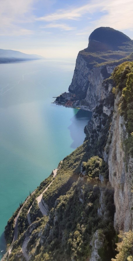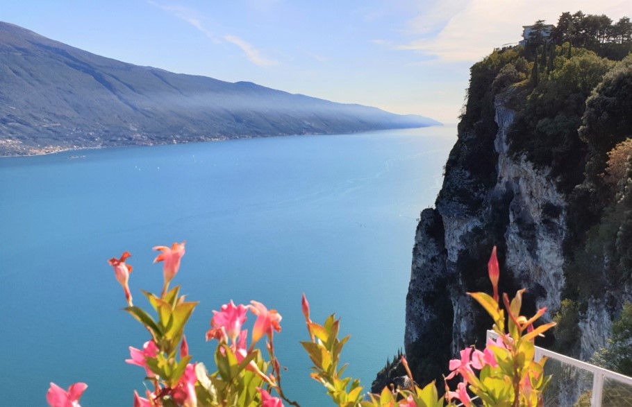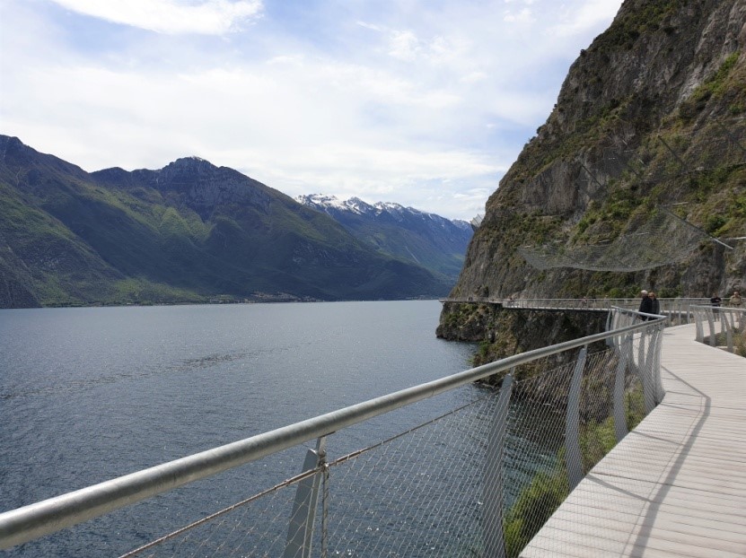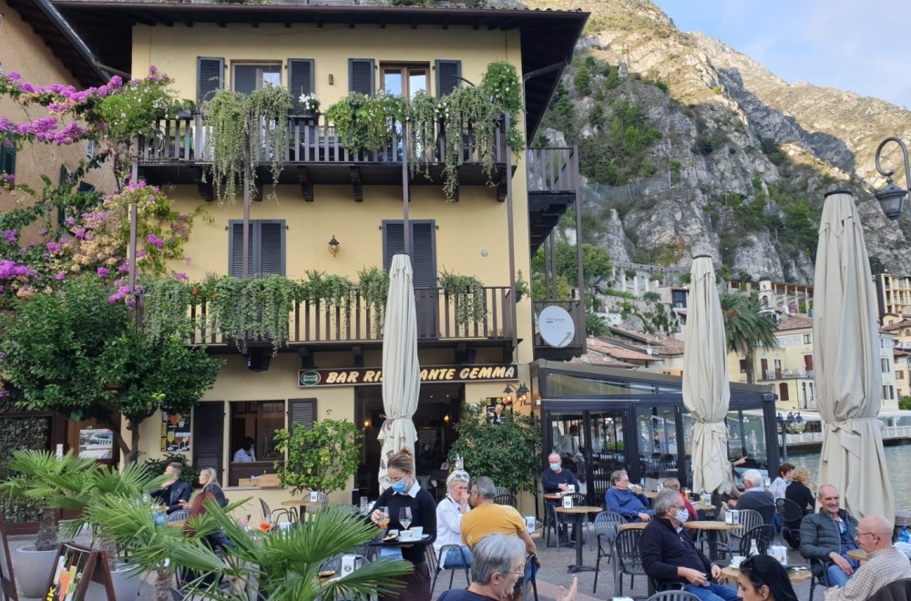 Wieder am See wartet schon das nächste Schaudererlebnis, diesmal in Limone, und wieder treffen die Tourismusattribute zu. Wer der Menge entfliegen möchte spaziert einfach durch den Ort hindurch und erreicht nach einer Wanderung zwischen alten Mauern und mediterraner Flora – hinter jedem Limonenbaum könnte Goethe sitzen und von dem Land reimen, in dem die Zitronen blühen – das neueste Teilstück eines Fahrradweges. Er soll einmal den See umrunden – wann, das wissen nur die Götter und auch die müssen erst das Orakel befragen. Dieser Weg führt nicht an den Abgrund, sondern befindet sich über dem Abgrund. Eine kühne Ingenieursleistung hat eine Art begeh- und fahrradbefahrbare Veranda an die steile Felswand bauen lassen, unten das Wasser, oben der Himmel. Die stabile Konstruktion wirkt Vertrauen erweckend, der Rückweg verdoppelt das Vergnügen und ein Besuch in der Trattoria Gemma verdreifacht es.