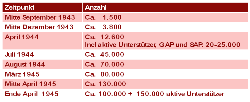Die folgende Tabelle[7] zeigt wie klein die Partisanenbewegung zunächst war, der es aber immerhin gelang, den Winter 43/44 in den Bergen zu überleben. Nach dem anfänglichen spontanen Widerstand gegen die Besatzung bildeten sich immer mehr kleine Kampfgruppen, von den Deutschen als „Banden“ tituliert, die sich den bekannten nicht-faschistischen Parteien zuordneten, die „Garibaldini“ z.B. zu den Kommunisten, die „Matteotini“ zu den Sozialisten, die „Fiamme Verdi“, die „Grünen Flammen“ zum katholischen Widerstand usw. Es gab aber auch autonom operierende Gruppen, die sich keinesfalls dem nationalen Befreiungskomitee zugehörig fühlten, das eher eine koordinierende Zentrale denn eine zentrale Kommandostelle war.