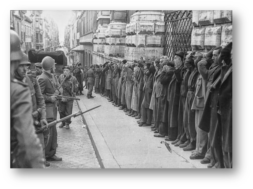 Durch die Veränderungen nach dem 8.September 1943 verschlechterte sich die Situation der Juden jedoch massiv, die deutsche Herrenrasse führte jetzt das Kommando und schlug unverzüglich zu. Schon fünf Wochen später kam es am 16.10.1943, unterstützt von Organen der neuen faschistischen Regierung, zu einer großen Razzia im jüdischen Ghetto Roms, wo etwa 25% aller italienischen Juden lebten. Die Verfolgungen dauerten in der gesamten Zeit der deutschen Besatzung an. 7500 Juden wurden ermordet, die meisten in Ausschwitz, etwa 13% der 58.000, sehr viel weniger also als in vielen anderen besetzten Ländern, wo wie in Polen und im Baltikum bis zu 90% aller Juden ermordet wurden[11].